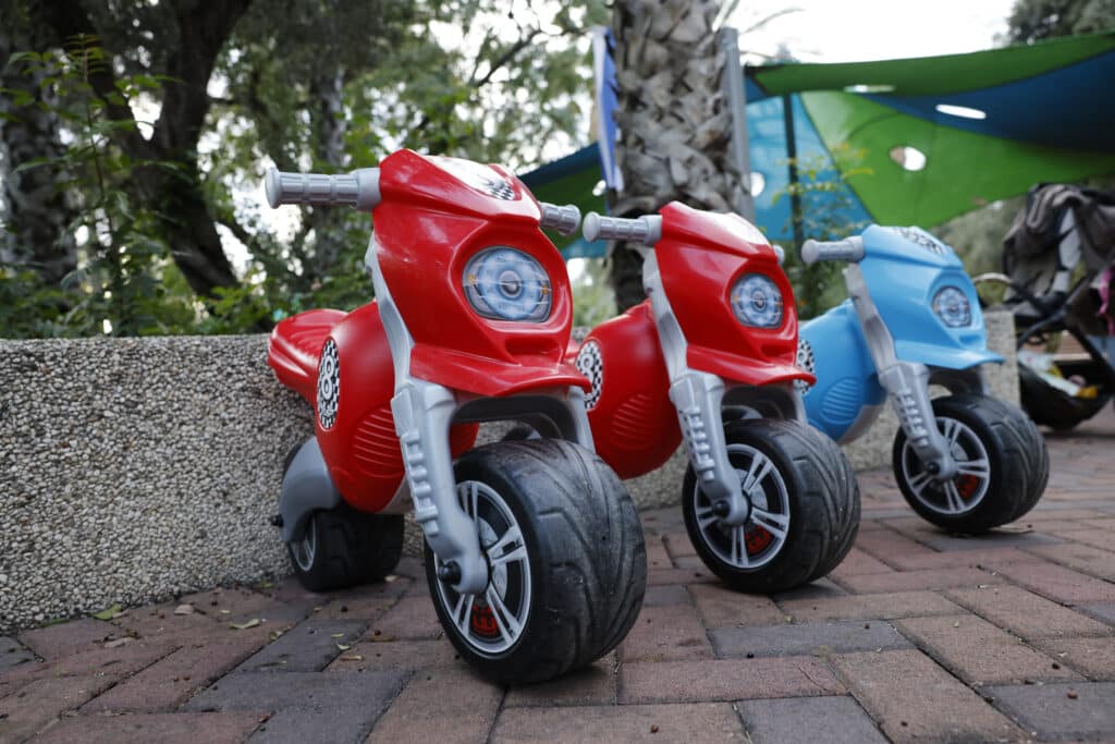 בימבות ואופניים מסוגים שונים עומדים בשורה ומחכים שירכבו עליהם